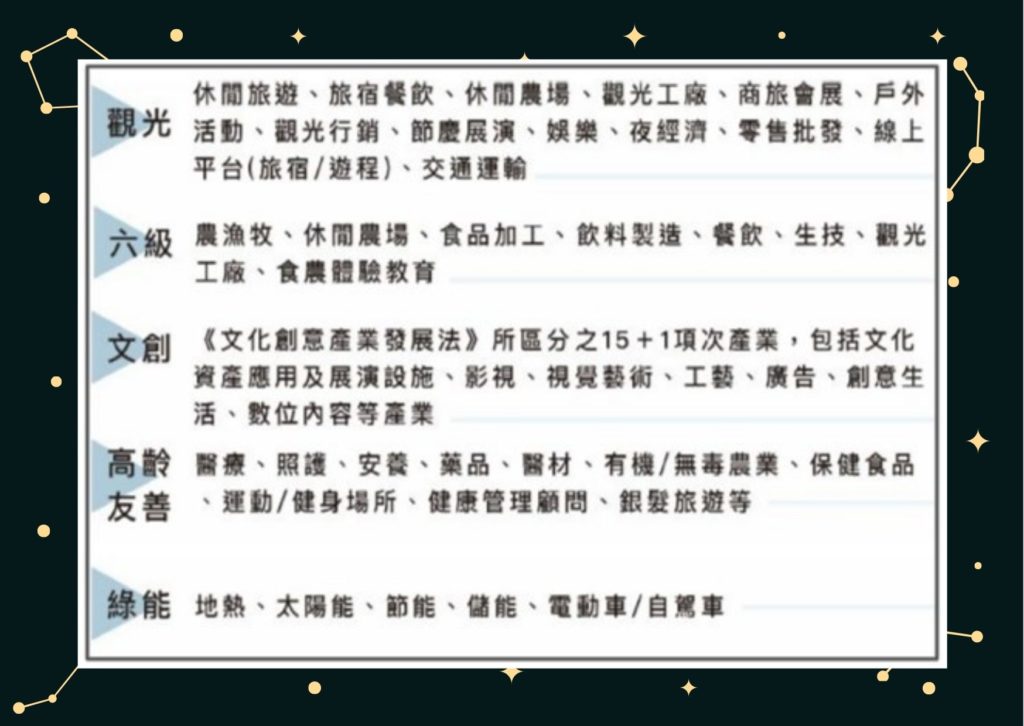 ◆觀光產業、六級產業、文創產業、高齡產業、綠能產業等重點產業,內容範圍如下表: